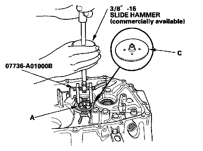 2. Remove the needle bearing (A) using the special tools, then remove the oil guide plate C.