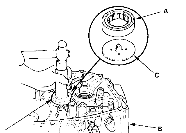 3. Position the oil guide plate C and new needle bearing (A) in the bore of the clutch housing (B).
