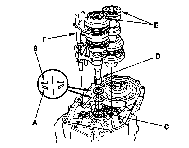 3. Apply tape to the mainshaft splines (D) to protect the seal. Install the mainshaft and the countershaft (E) into the shift forks (F), and install them as an assembly.