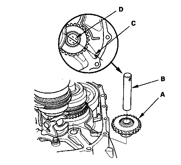 5. Install the reverse idler gear (A) and the reverse gear shaft (B) by aligning the mark (C) with the reverse gear shaft hole (D).