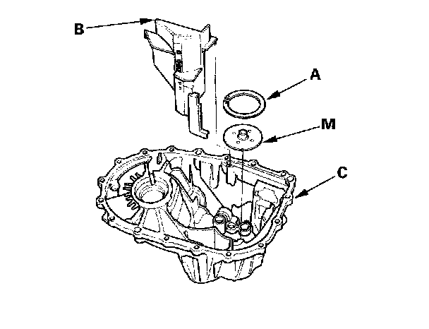 7. Select the proper size 72 mm shim (A) according to the measurements made during the Mainshaft Thrust Clearance Adjustment. Install the oil gutter plate (B), the oil guide plate M, and the 72 mm shim into the transmission housing (C).