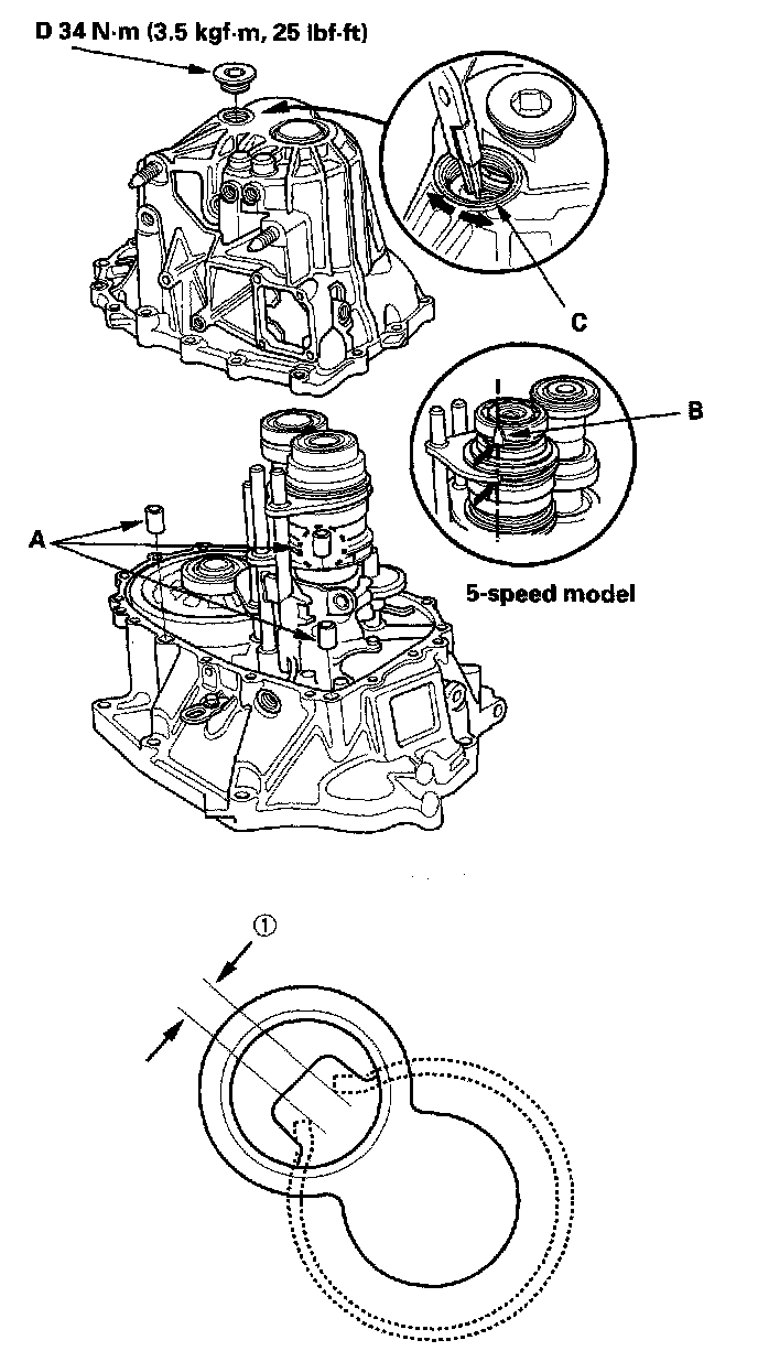 13. Apply liquid gasket (P/N 08718-0001) to the threads of the 32 mm sealing cap (D), and install it on the transmission housing.
