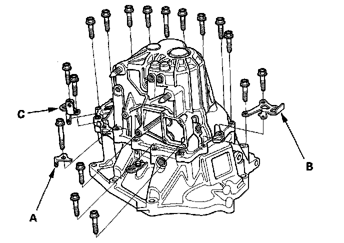 14. Install the harness bracket (A) (6-speed model only), the transmission hanger A (B), the transmission hanger B (C), and the 8 mm flange bolts, finger-tight.