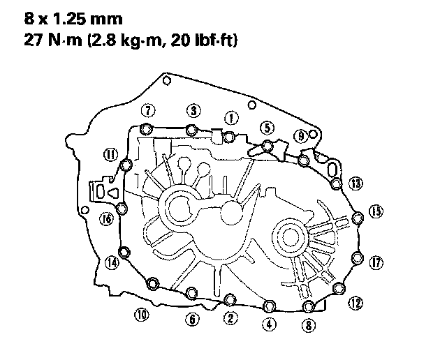 NOTE: If 5 minutes have passed after applying liquid gasket, reapply it, and assemble the housings. Allow it to cure at least 20 minutes after assembly before filling the transmission with fluid.