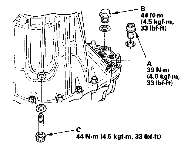 19. Install the drain plug (A), the filler plug (B), and the 10 mm flange bolt (C) with new washers (2002-2004 models).
