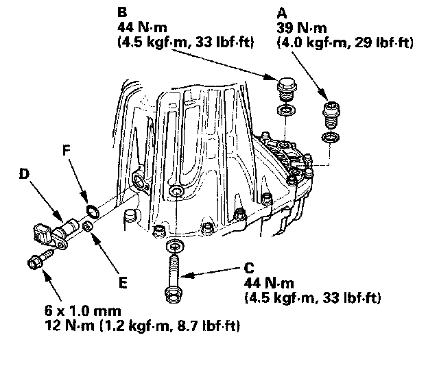 20. Install the drain plug (A), the filler plug (B), the 10 mm flange bolt (C), the output shaft (countershaft) speed sensor (D), the plain washer (5-speed model) (E), and the new O-ring (F) (2005 model).