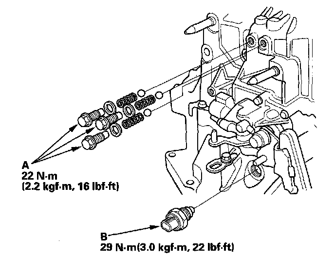 21. Install the detent bolts (A), the springs, and the steel balls with new washers.