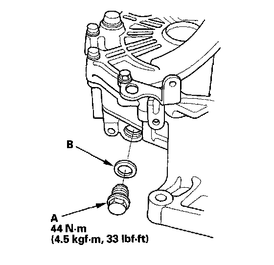 22. Apply liquid gasket (P/N 08718-0001) to the threads of the back-up light switch (B), and install it on the transmission housing.