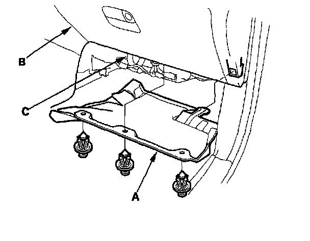 5. Remove the dashboard lower cover (A) under the glove box (B) to expose the PCM connectors (C).