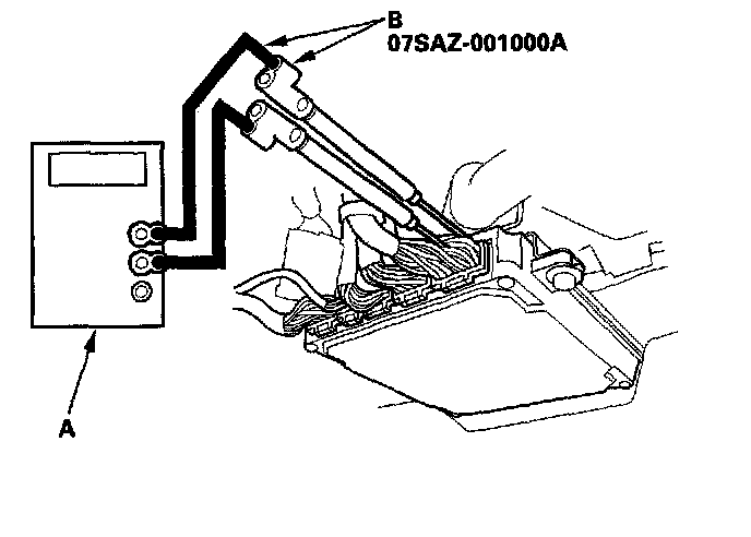 6. Connect a digital multimeter (A) and the special tools (B) to check voltage between PCM connector terminals A15 (+) and A23 (-) or A24 (-) (2002-2004 models), A29 (+) and A8 (-) or A9 (-) (2005 model).