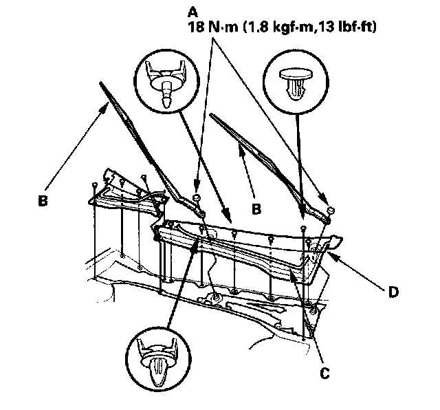 1. Open the hood. Remove the nuts (A) and the windshield wiper arms (B).