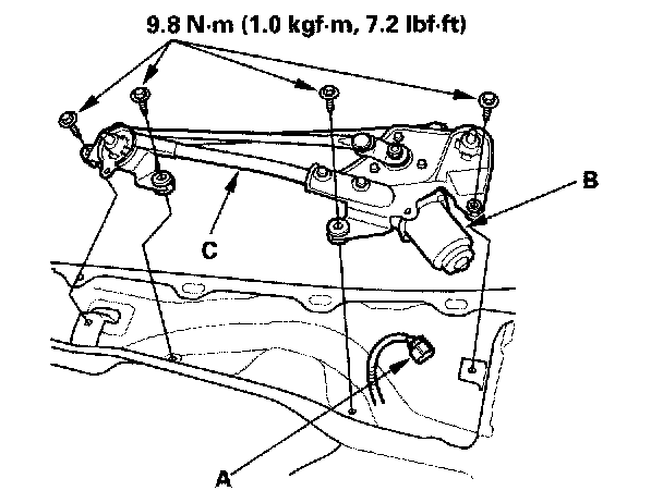5. Install in the reverse order of removal. Check the wiper motor operation.