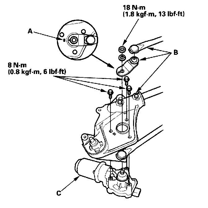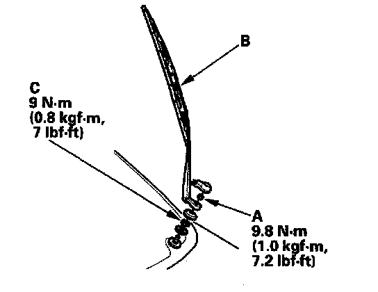 2. Remove the mounting nut (A), wiper arm (B), and special nut (C).