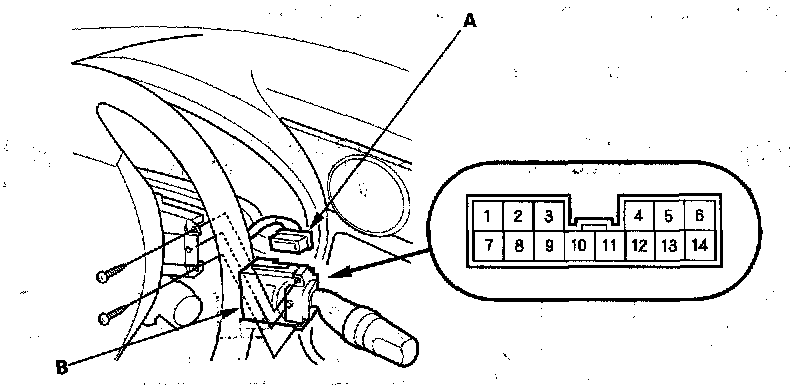 3. Disconnect the 14P connector (A) from the wiper/washer switch (B).