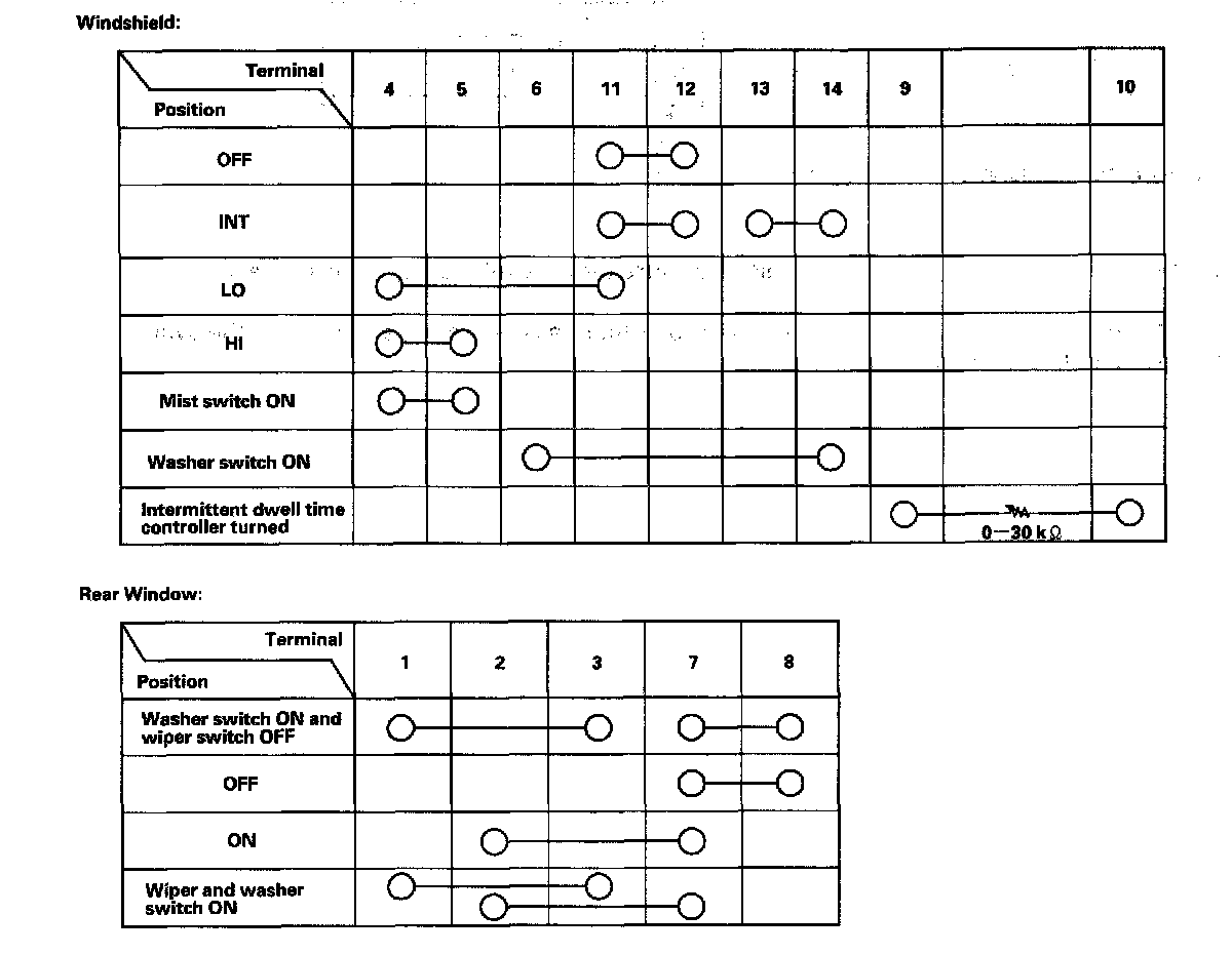 - If the terminals look OK, check for continuity between the terminals in each switch position according to the tables.