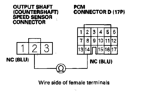 18. Check for continuity between PCM connector terminal D14 and output shaft (countershaft) speed sensor connector terminal No. 2.