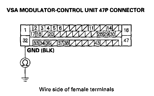14. Check for continuity between VSA modulator-control unit 47P connector terminal No.32 and body ground,
