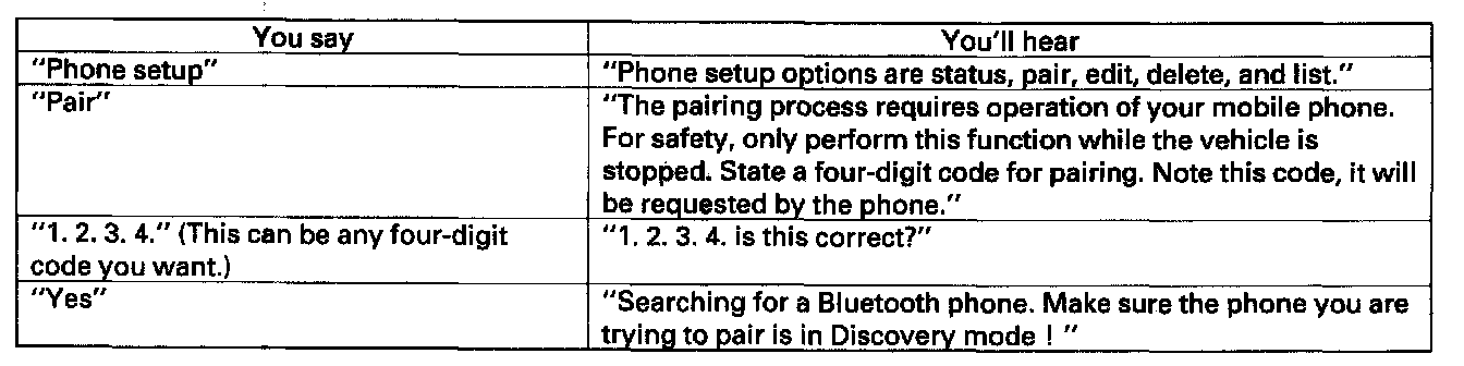 4. When prompted, enter the four-digit PIN from step 2 into the phone. You will hear the HFL say "A new phone has been found. Would you like to name this phone?"