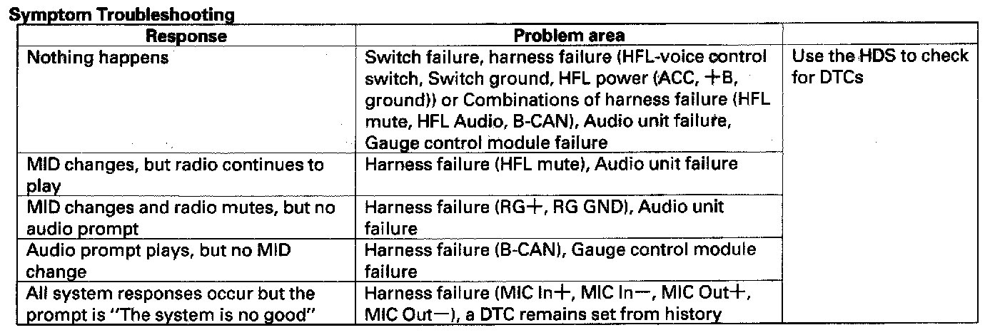 - If there are any DTCs, the HandsFreeLink control unit audibly outputs "The hands free system needs to be serviced".