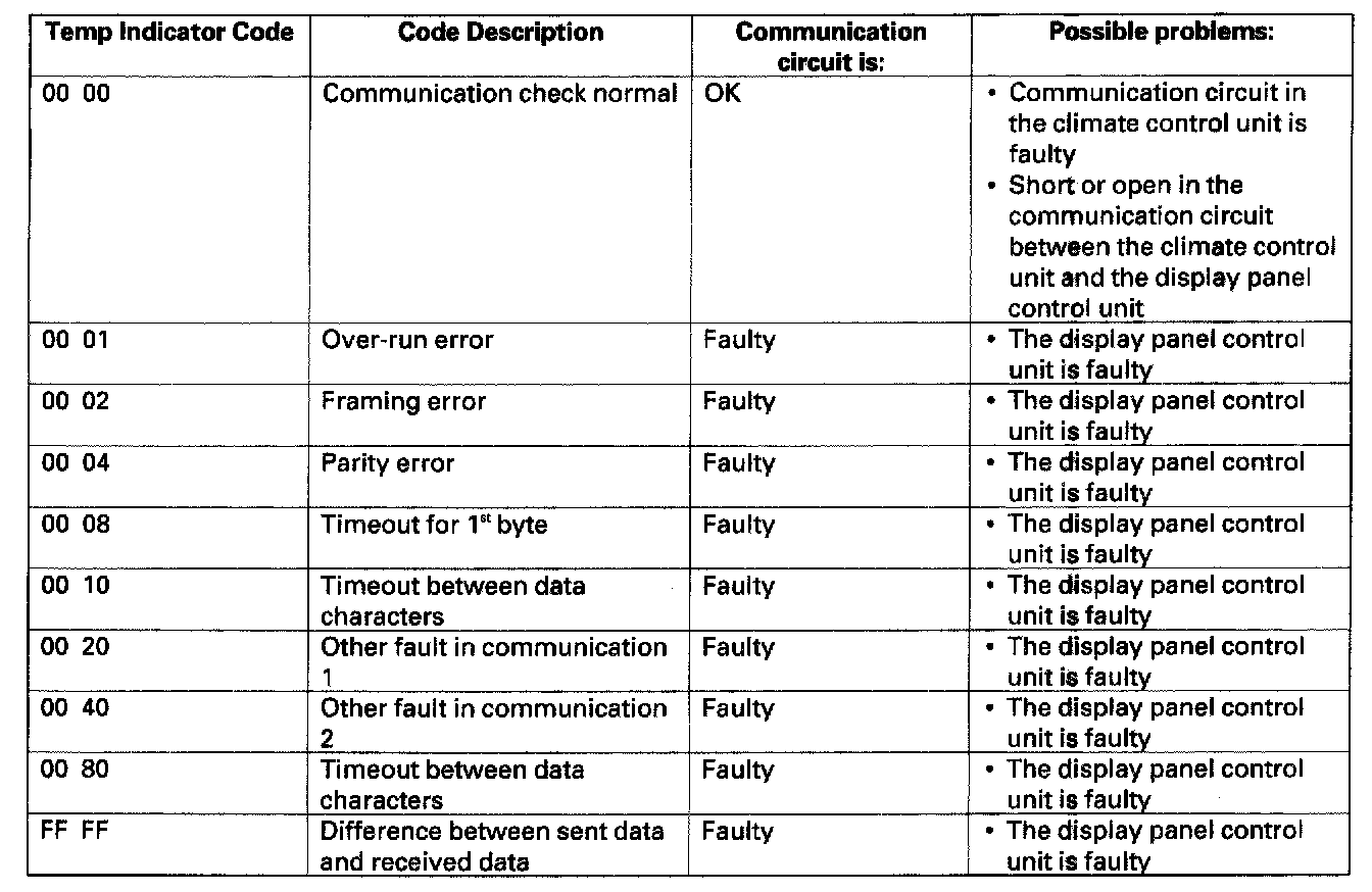 4. The driver's temperature and passenger's temperature indicators will display a code. Check the code in the list above. If the code is considered OK, then the center panel module's communication circuit is OK. If the code is considered a fault, replace the center panel module.