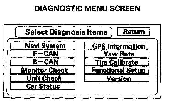 b. If the battery was disconnected and reconnected prior to this test, hold down the Menu and Zoom Out buttons at the "Code" or "GPS Acquire" screen. The display will go to the "Navi System Link" screen. Push the joystick to go to the "Functional Setup menu," then touch the Return icon to get to the "Select Diagnosis Items" menu.