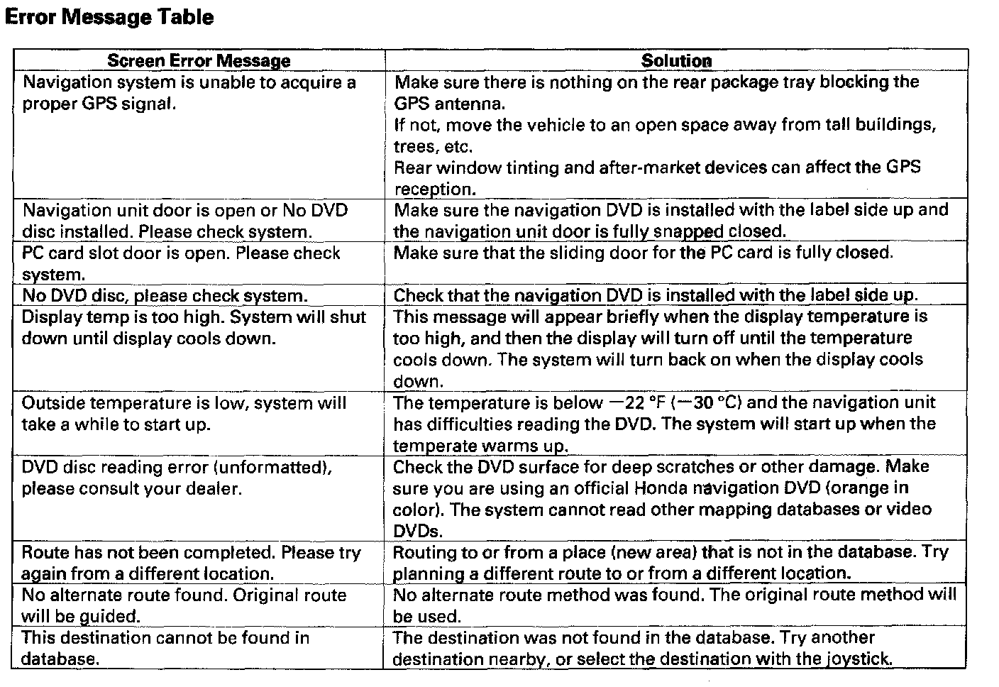 Error Message Table