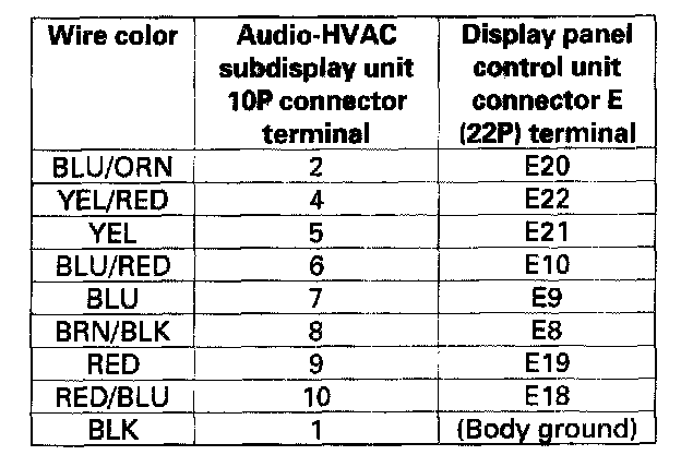 3. Check for continuity between the audio-HVAC subdisplay unit 10P connector and the display panel control unit connector E (22P) terminals according to the table.