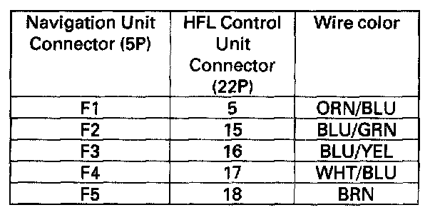 4. Check for continuity between navigation unit connector F (5P) terminals and HFL control unit connector (22P) terminals according to the table.