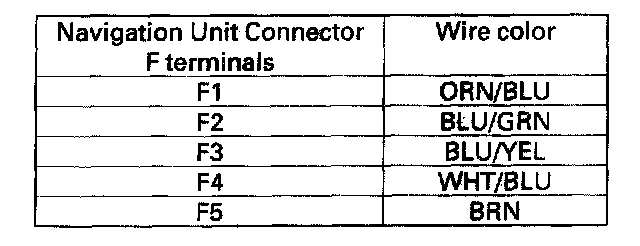 5. Check for continuity between the navigation unit connector F (5P) terminals and body ground according to the table.