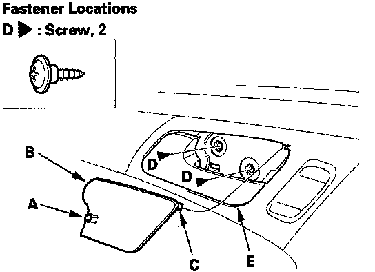 2. Using a trim tool, push on the rear hook (A) and pivot the cover (B) on the front hook (C), then remove the cover and the screws (D) securing the inner handle (E).