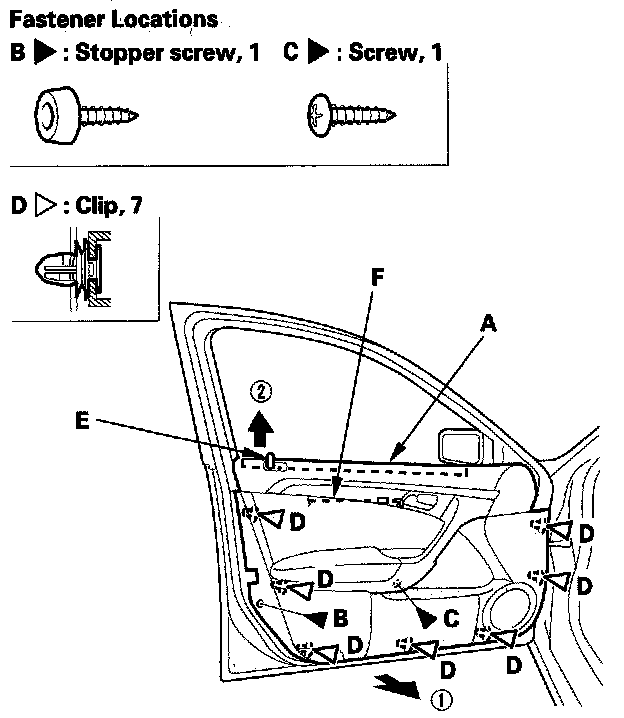 2. Release the clips (D) that hold the door panel with a commercially available trim pad remover.