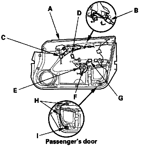 4. While holding the door panel (A) away from the door, disconnect the inner handle cable (B), driving position memory switch connector (C) (driver's door), power door lock switch connector (D), power window switch connector (E, F), harness connector (G) (driver's door), door courtesy light harness clips (H) (passenger's door), and remove the door courtesy light (I) (passenger's door) by turning it counterclockwise one quarter turn.