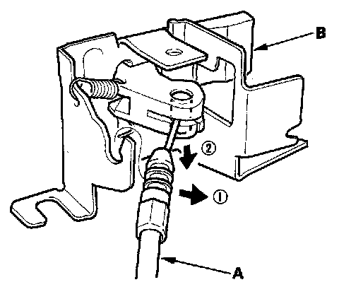 5. Disconnect the fuel fill door opener cable (A), then remove the opener (B). Take care not to kink the cable.