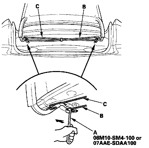2. Put on gloves to protect your hands. Remove the torsion bars with the torsion bar tool (A) from both trunk lid hinges. First remove the left torsion bar (B), then remove the right torsion bar (C).