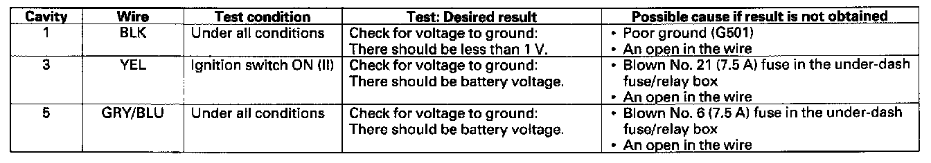 5. Disconnect the 10P connector from the under-hood fuse/relay box, and make these input tests at the connector.