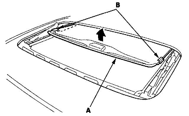 4. While lifting the front portion of the sunshade (A), move the sunshade forward until you can see both rear sunshade base sliders (B). Do not damage the sunshade.