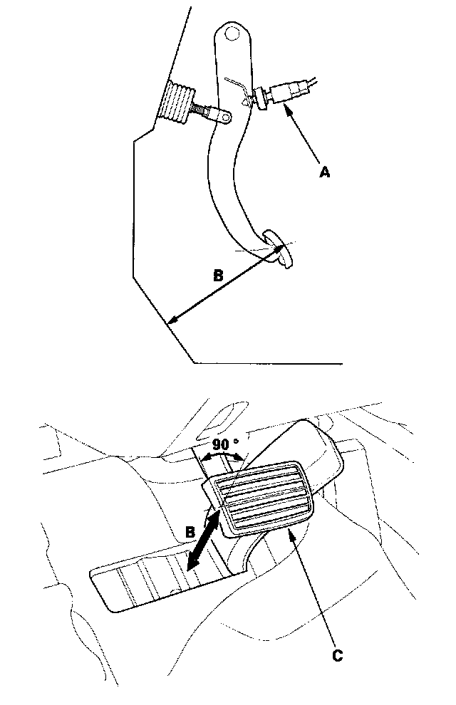 2. Lift up the carpet. At the insulator cutout, measure the pedal height (B) from the left side middle of the pedal pad (C).