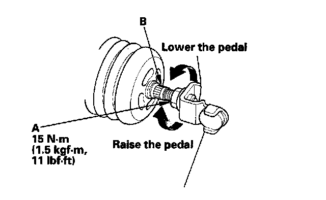 3. Loosen the pushrod locknut (A), and screw the pushrod (B) in or out with pliers until the standard pedal height from the floor is reached. After adjustment, tighten the locknut firmly. Do not adjust the pedal height with the pushrod pressed.