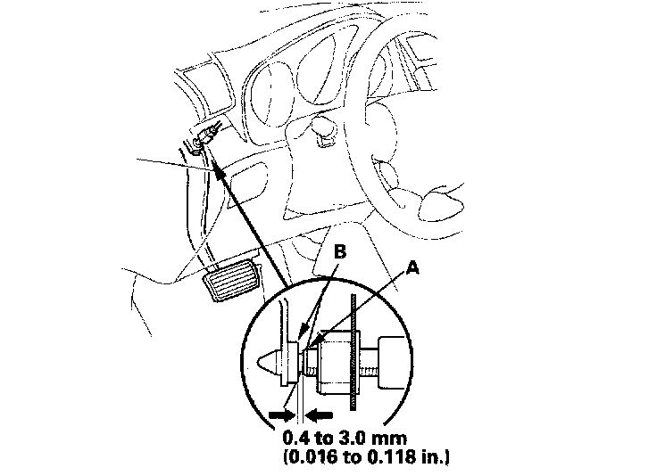 4. Push in the brake pedal position switch until its plunger is fully pressed (threaded end (A) touching the pad (B) on the pedal arm). Then, turn the switch 45° clockwise to lock it. The gap between the brake pedal position switch and the pad is automatically adjusted to 0.4 to 3.0 mm (0.016 to 0.118 inch) by locking the switch. Make sure the brake lights go off when the pedal is released.