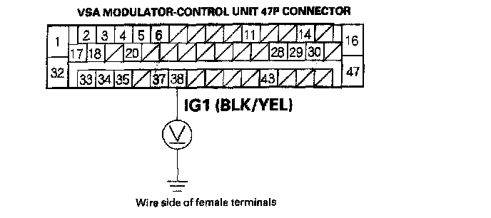 7. Measure the voltage between the VSA modulator-control unit 47P connector terminal No. 38 and body ground.
