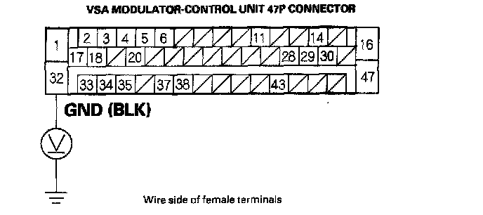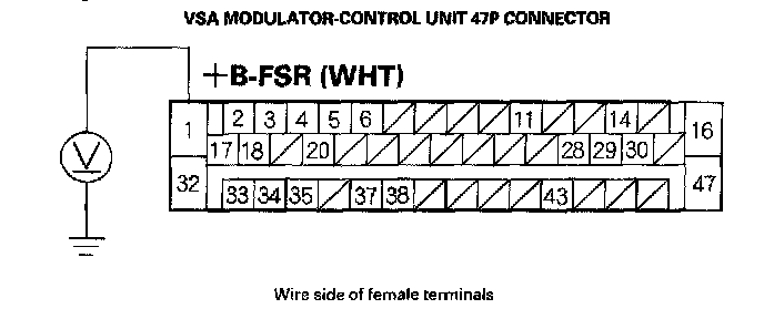 11. Measure the voltage between the VSA modulator-control unit 47P connector terminal No. 32 and body ground.