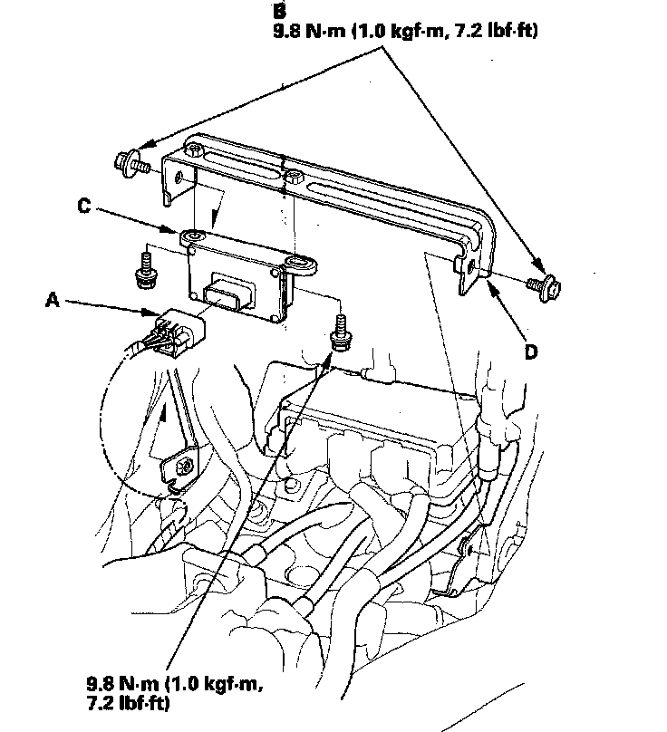 4. Remove the yaw rate-lateral acceleration sensor (C) with the bracket (D).