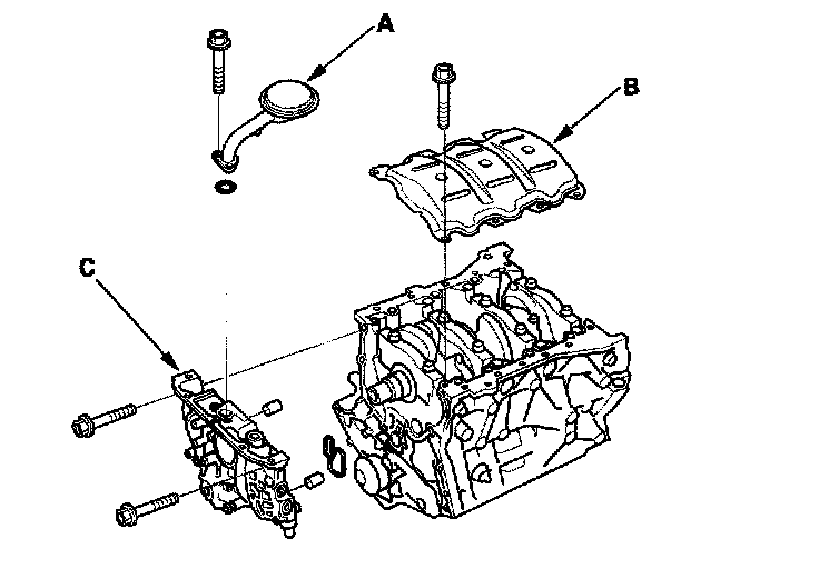 11. Remove the oil screen (A), baffle plate (B), and oil pump (C).