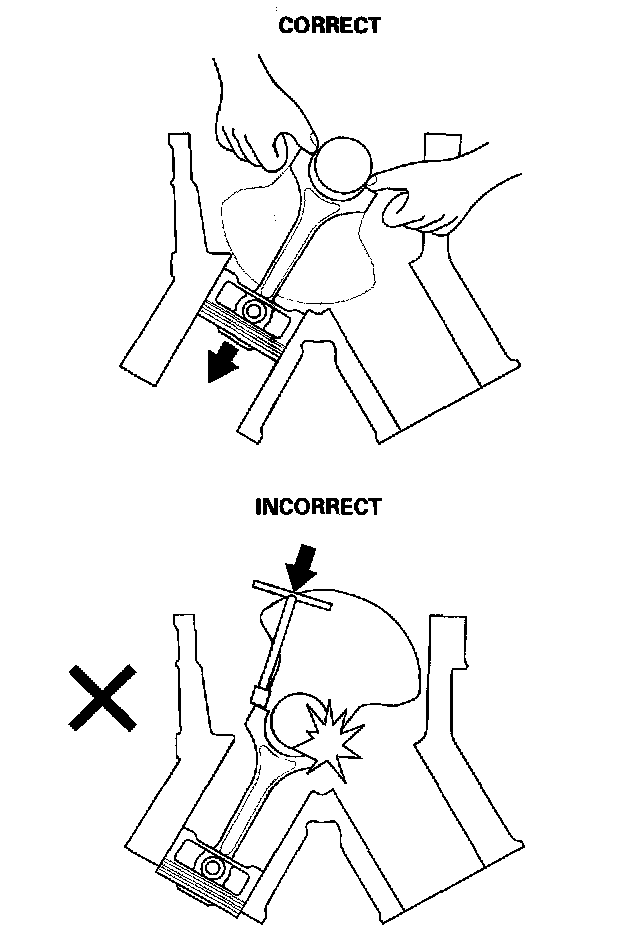 13. Remove the connecting rod caps after setting the crank pin at bottom dead center (BDC) for each cylinder. Remove the piston/connecting rod assembly by pushing on the connecting rod. Take care not to damage the crank pin or cylinder with the connecting rod.