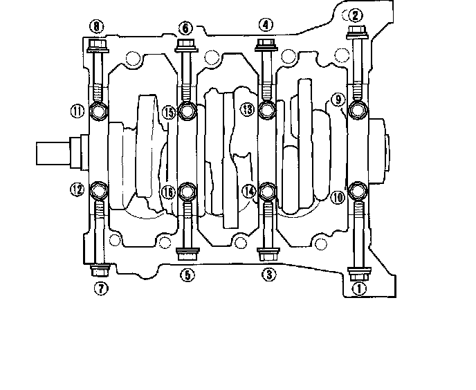 18. Unscrew the bearing cap bolts and bearing cap side bolts in sequence 1/3 turn at a time; repeat the sequence until all bolts are loosened.