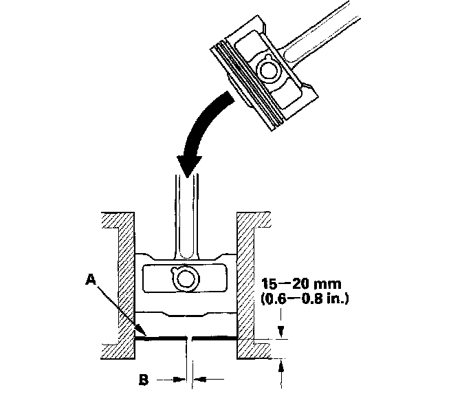 4. Using a piston, push a new ring (A) into the cylinder bore 15 - 20 mm (0.6 - 0.8 inch) from the bottom.