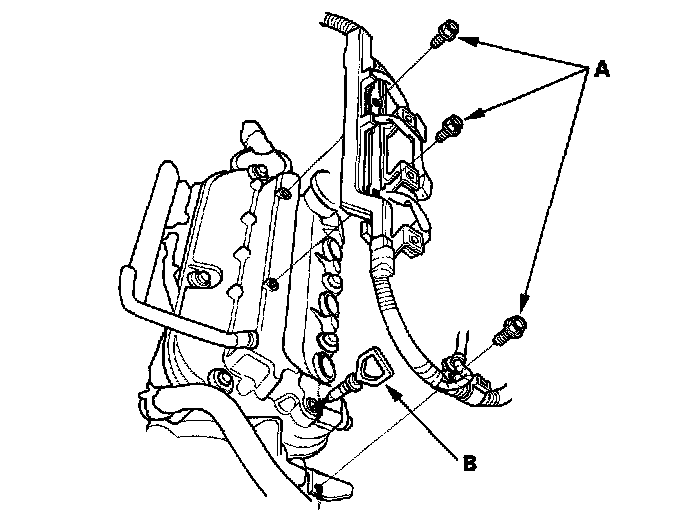 3. Remove the three bolts (A) securing the harness holder, and remove the dipstick (B).