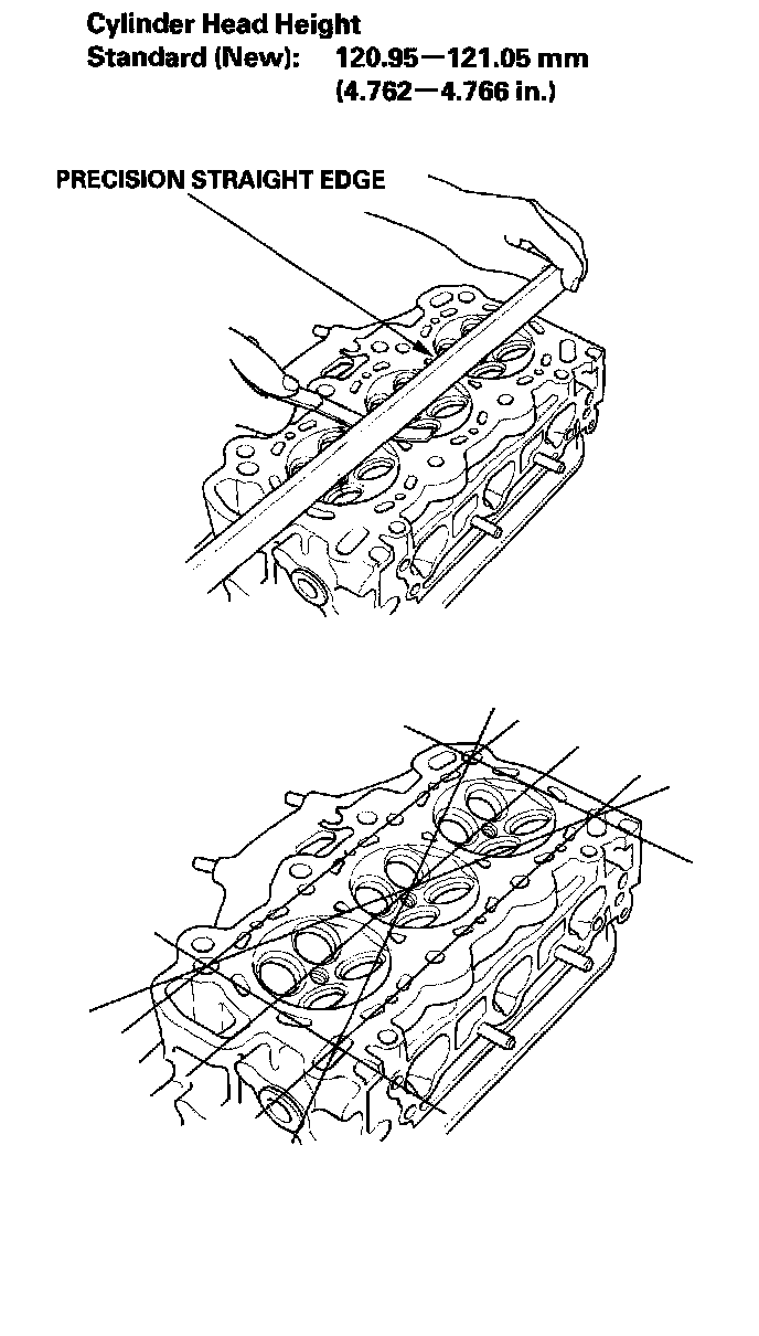 3. Check the cylinder head for warpage. Measure along the edges, and three ways across the center.