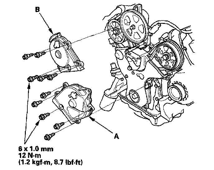 Remove the bolt (A), then remove the timing belt adjuster (B) and collar (C).