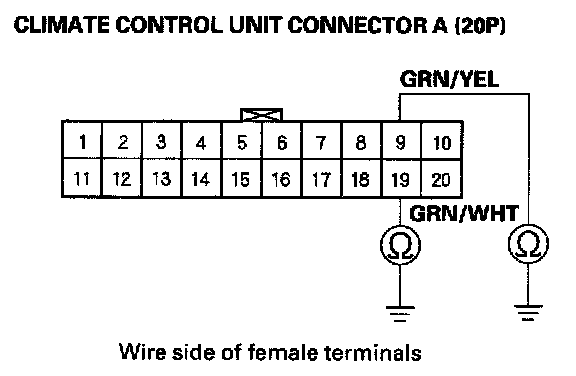 8. Check for continuity between the No. 9 and No. 19 terminals of climate control unit connector A (20P) and body ground individually.